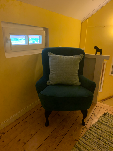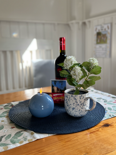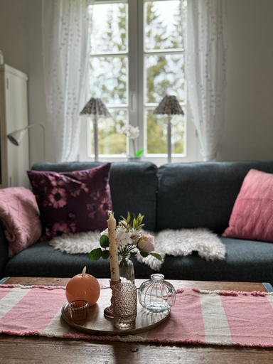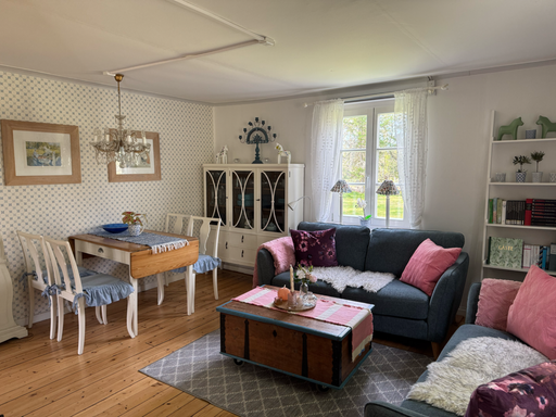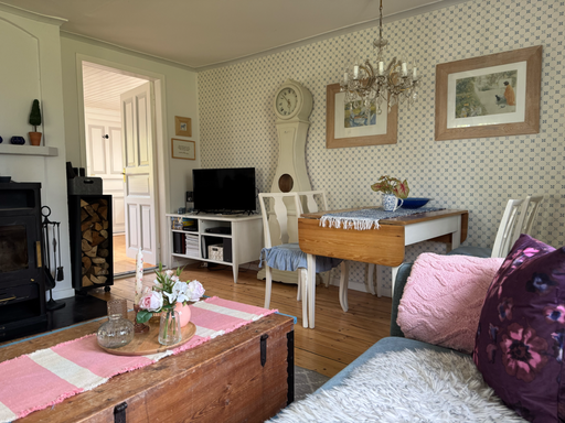 Im weiß-blau eingerichtete Wohnzimmer kann man die Abende am Feuer genießen, Musik hören, Bücher aus der kleinen Bibliothek von Mankell oder anderen schwedischen Autoren lesen, auf dem Harmonium spielen oder deutsches und schwedisches Fernsehen schauen. Natürlich haben Sie auch eine Stereoanlage mit CD-Spieler mit Hörbüchern z. B. von Mankell sowie einen DVD-Player mit vielen Filmen u. a. von Astrid Lindgrens Geschichten (Pippi Langstrumpf, Michel von Lönneberga, Kinder von Bullerby usw.) aber auch z. B. Kommissar Beck.