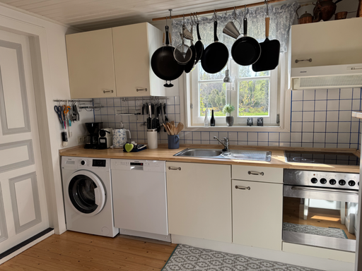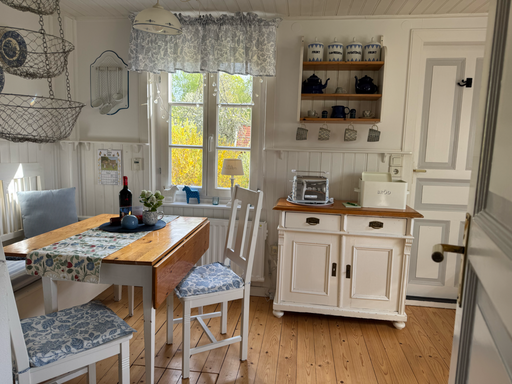 Eine im schwedischen Landhausstil eingerichtete Küche mit einem gemütlichen Küchensofa ist hervorragend ausgestattet. Der alte Küchenherd lässt sich immer noch einheizen, um z. B. gefundene Steinpilze zu trocknen. Man kann sagen, in der Küche fehlt es an nichts.