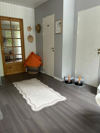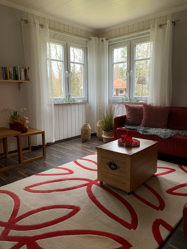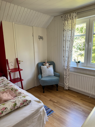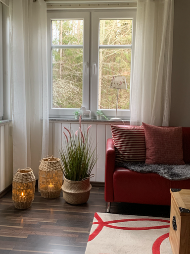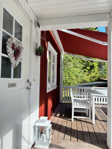 Im rot-weiß eingerichteten Wohnzimmer kann man die Abende am Feuer genießen, schwedische Krimis aus der kleinen Bibliothek lesen, ein Spiel aus der Spielesammlung spielen, Musik hören oder deutsches Fernsehen schauen.