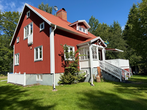 Das Haus liegt umgeben von Bäumen am Rande des Waldes, aber noch im Dorf Kråkshult mit Nachbarhäusern in Sichtweite.